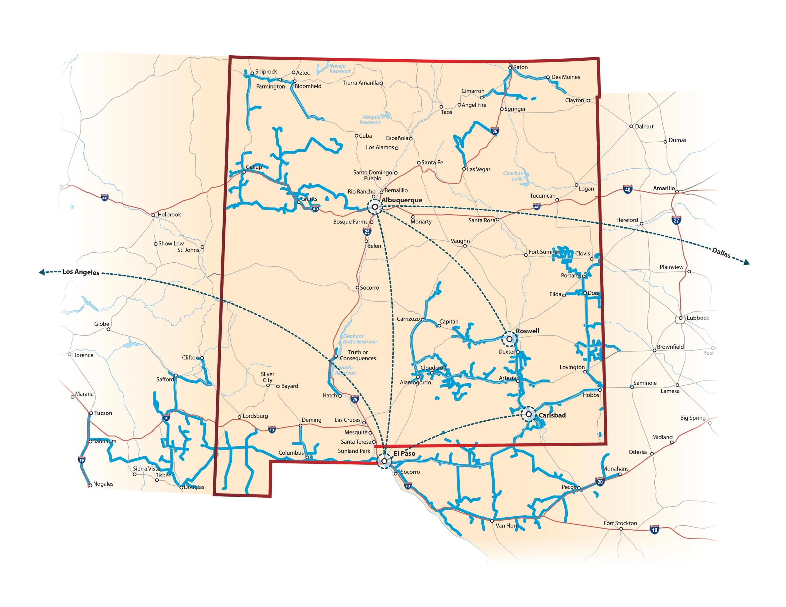 We offer reliable and scalable fiber solutions. Our backbone infrastructure provides direct and diverse access, enabling faster and more efficient business connections. Our mission is to lower the cost of connecting unserved and underserved areas throughout New Mexico for our customers.